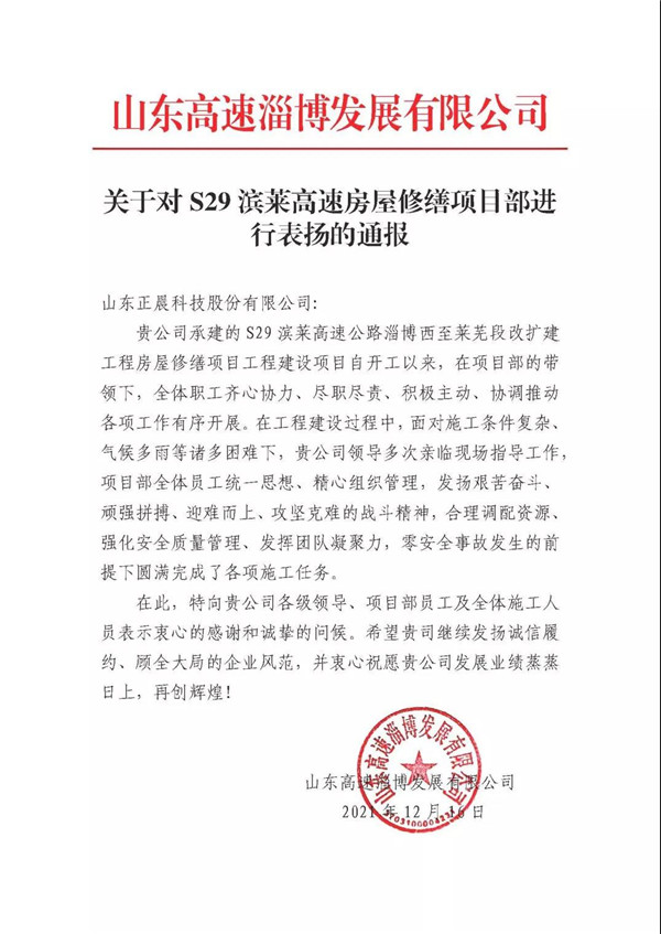 近日,九游官网承建的S29滨莱高速公路淄博西至莱芜段改扩建工程房屋修缮项目获得业主表扬!