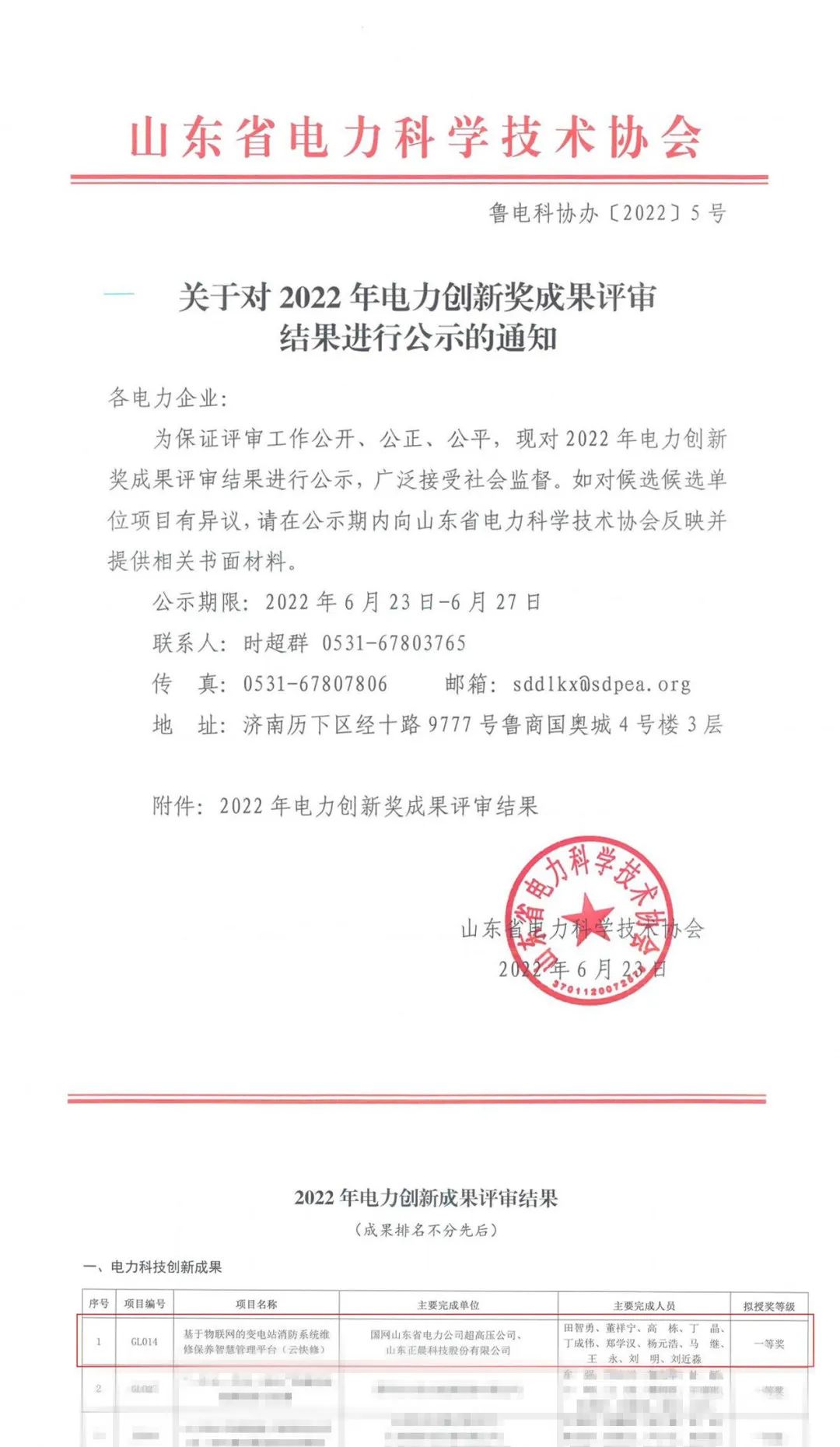 近日,九游官网与国网山东省电力公司超高压公司联合研发的《基于物联网的变电站消防系统维修保养智慧管理平台(云快修)》通过了山东省电力科学技术协会评审,荣获2022年电力科技创新成果一等奖,并获推荐申报中国电力企业联合会2022年度电力创新奖。